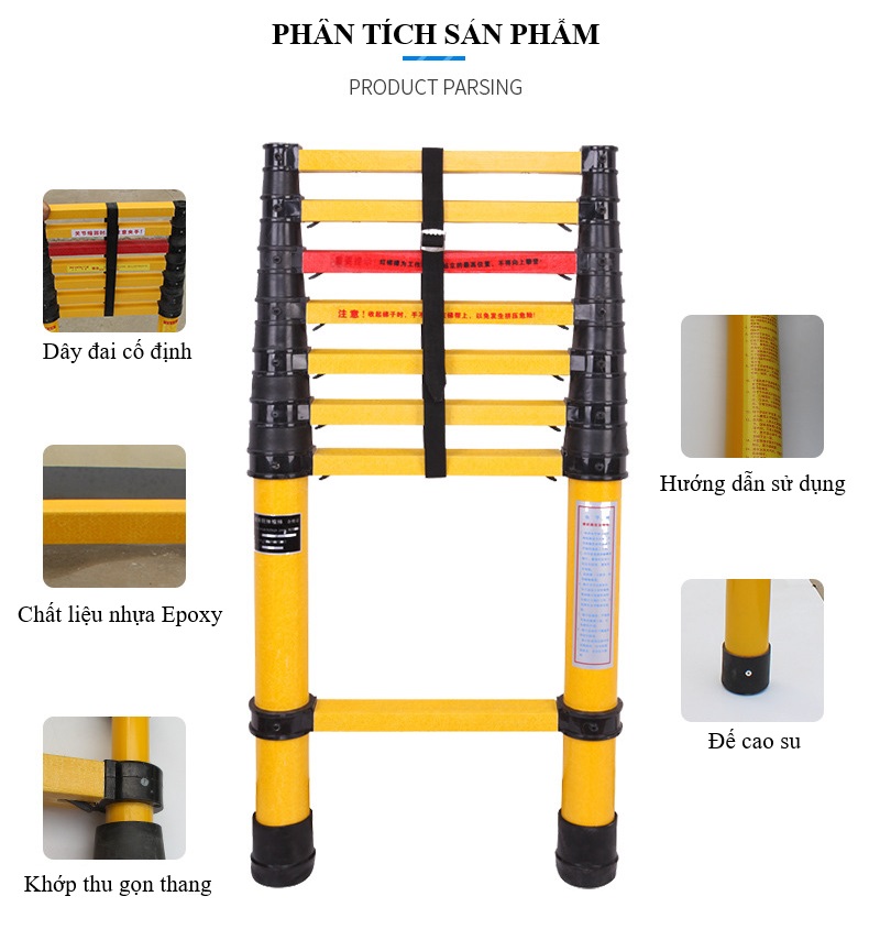 Thang rút cách điện được làm bằng chất liệu sợi thủy tinh cao cấp vừa đảm bảo được độ bền, nhẹ và cách điện tuyệt đối. Thang rút đạt độ bền chắc vượt trội, không móp méo, nứt gãy khi sử dụng với tải trọng lên đến 200 kg.