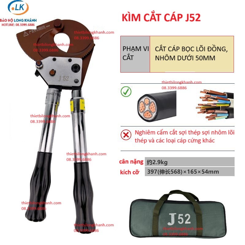 Kìm cắt cáp nhông cỡ lớn J52 sử dụng cơ chế bánh răng đòn bẩy để cắt dây cáp đồng và nhôm hay cáp điện thoại không để lại gờ và cạnh sắc nét với một lực phù hợp của người thợ.